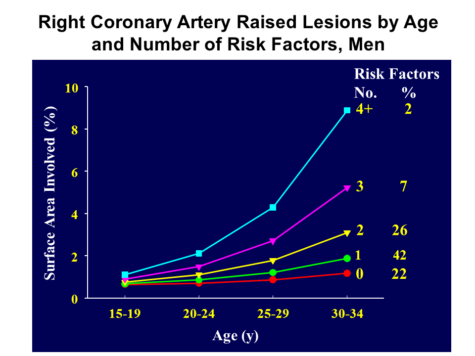This Figure shows the increasing risk with age with increasing number of risk factors, and this serves to underline the importance of identifying additional risk factors in individuals with FH. The data are from the Pathobiological Determinants of Atherosclerosis in Youth (PDAY) study,[18] which correlated atherosclerotic burden measured directly at autopsy and risk factors measured postmortem. The data, in 5-year increments, represent the amount of advanced American Heart Association grade 4 or 5 atherosclerotic lesions, by age and by number of risk factors, and it is clear that as the number of risk factors increases, the severity of advanced atherosclerosis increases. What is most important about these data is to recognize that advanced atherosclerosis develops beginning late in the second decade of life and accelerates dramatically in the third and early fourth decades. This again underlines the importance of recognizing these risk factors very early in life and treating them early, because this represents the best opportunity to arrest the entire atherosclerotic process and preclude or at least retard the development of advanced atherosclerosis and plaque.