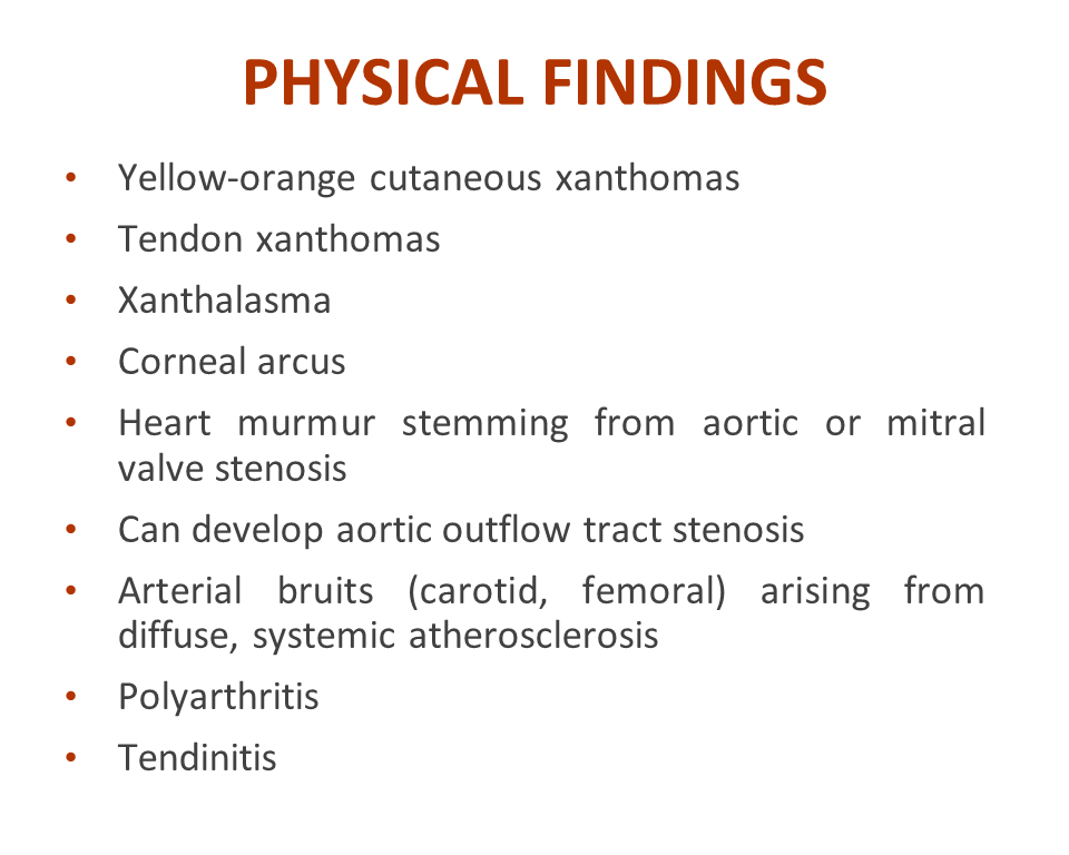 What are some of the most important physical findings of FH? As listed in the Figure, the classic ones include: yellow-orange cutaneous xanthomas, tendinous xanthomas, as well as periorbital xanthelasma or corneal arcus (which especially in patients <45 years of age can be highly suggestive of FH). FH patients can also be expected to develop heart murmurs stemming from aortic or mitral valve stenosis, and can also develop marked aortic outflow tract stenosis. Arterial bruits are relatively common because of plaque development within the carotid and femoral vessels, and finally these patients can suffer from polyarthritis and chronic tendinitis.