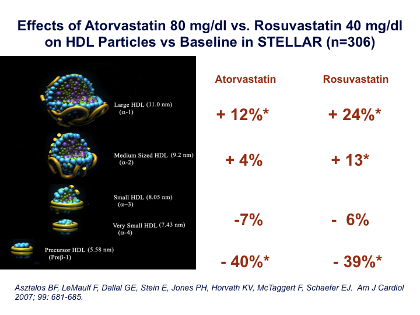 As an additional observation, comparing atorvastatin versus rosuvastatin, it can be seen in the Figure that rosuvastatin appears to be more effective than atorvastatin in decreasing pre-beta1 HLD particle content in favor of increasing the percentage of very large alpha1 HDL particles.