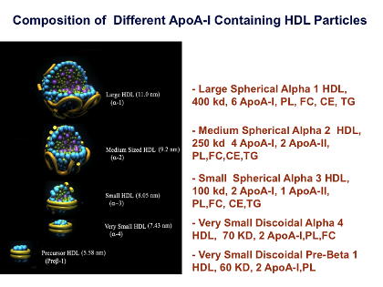 This Figure recreates the information in the 2-D electrophoresis gel as a cartoon, showing the composition of this spectrum of HDL particles, for which the major protein is apoA-I. As can been seen, at the bottom are the very small precursor (pre-beta1) particles, which are discs of lipoprotein with 2 molecules of apoA-I and a molecular weight of about 60 kiloDaltons (KD). As these discs enter the circulation and begin to take up cholesterol, they become the very small, discoidal alpha4 HDL particles; these also have 2 molecules of apoA-I, but now they contain some cholesterol.