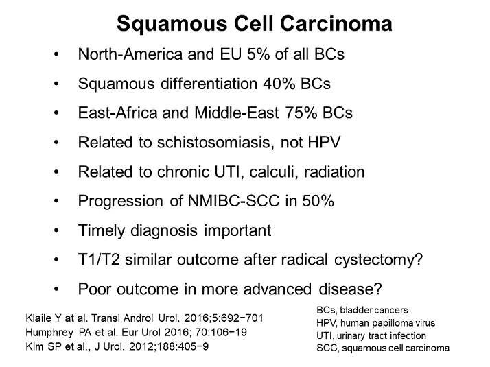 FIG. 23: Squamous cell carcinoma is rare in North America and the EU, where they represent about 5% of bladder cancer cases, but up to 40% of all cases show some squamous differentiation.[7] In East Africa and in the Middle East, this picture is changing dramatically, and up to 75% of all cases have been suggested to be squamous rather than urothelial.[7] Squamous cell carcinoma is linked to schistosomiasis, but not with the human papilloma virus (HPV).[11] It is also linked to chronic urinary tract infection, to the presence of bladder calculi, and to exposure to radiation, of the type and dose administered in treatment of cancer.