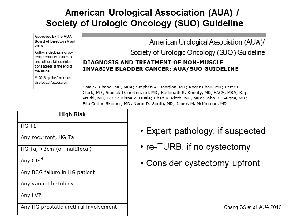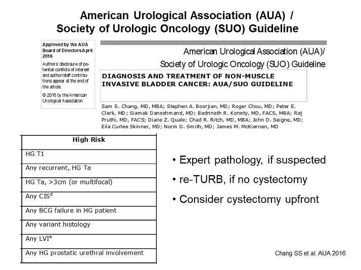 Chang SS, Boorjian SA, Chou R, et al. Diagnosis and treatment of non-muscle invasive bladder cancer; unabridged version: American Urological Association (AUA)/Society of Urologic Oncology (SUO) guideline. Linthicum, MD: American Urological Association; 2016 https://www.auanet.org/documents/education/clinical-guidance/Non-Muscle-Invasive-Bladder-Cancer.pdf Accessed August 11, 2017