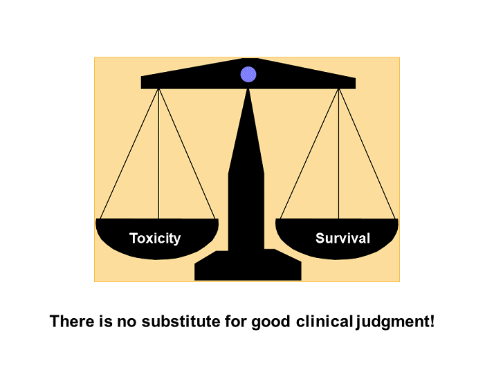 FIG. 20: Toxicity and survival are both important, and there is no substitute for good clinical judgment. If an ill patient cannot tolerate cisplatin-based chemotherapy, then proceeding with definitive treatment seems reasonable. However, for a patient with muscle-invasive bladder cancer who can tolerate cisplatin-based neoadjuvant chemotherapy, this additional treatment can be life-saving.