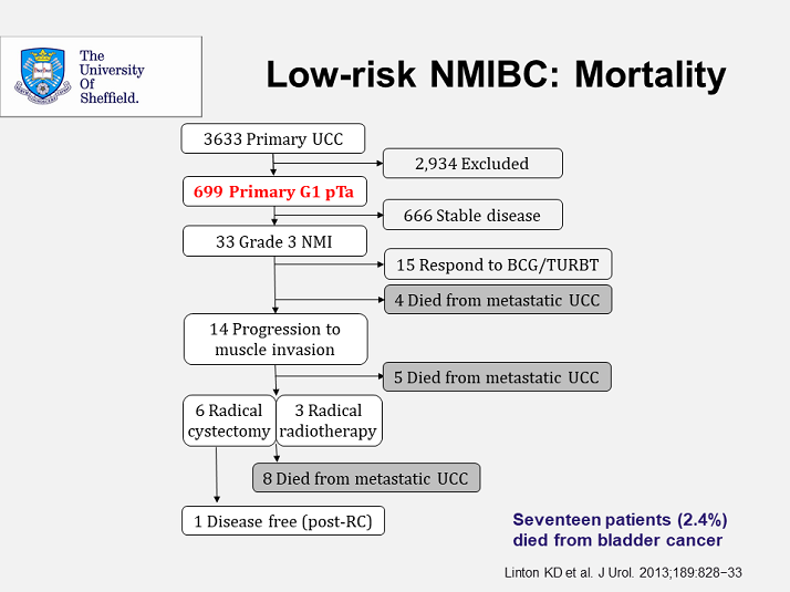 Overall 17 of the original cohort of 699 primary Grade I pTa tumor patients died from bladder cancer, which represents a very small 2.4% mortality rate.