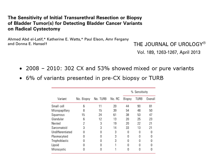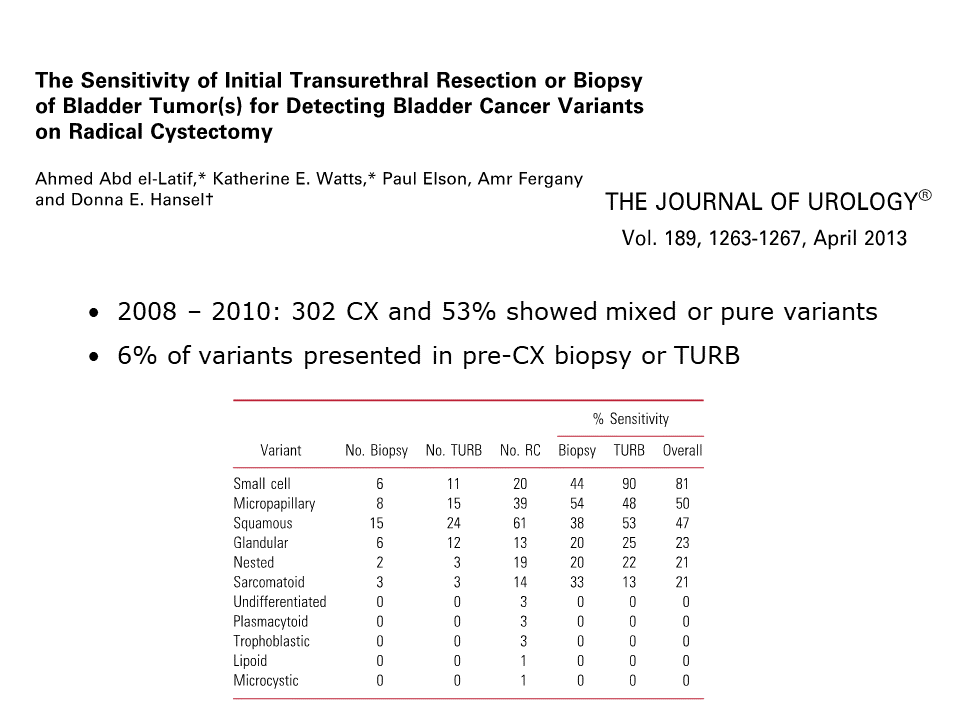 Abd El-Latif A, Watts KE, Elson P, et al. The sensitivity of initial transurethral resection or biopsy of bladder tumor(s) for detecting bladder cancer variants on radical cystectomy. J Urol. 2013;189:1263−7 http://dx.doi.org/10.1016/j.juro.2012.10.054