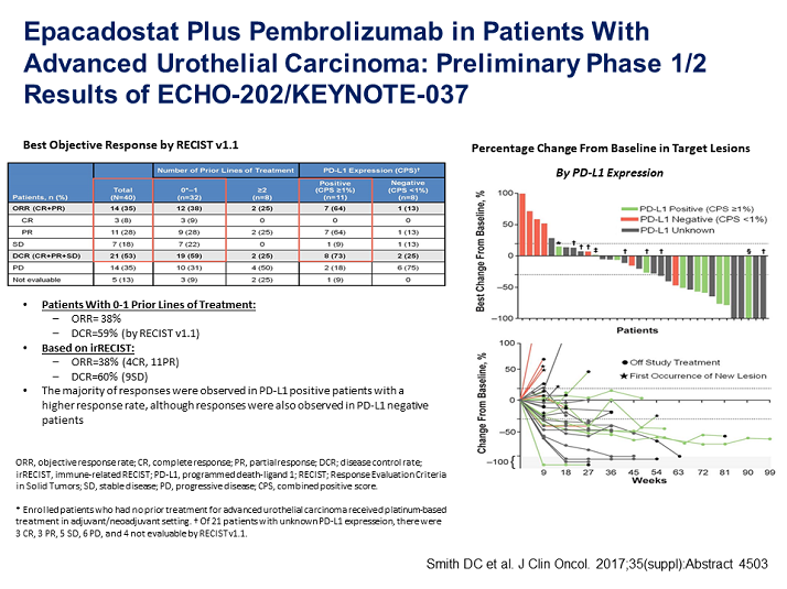 Smith DC, Gajewski T, Hamid O, et al. Epacadostat plus pembrolizumab in patients with advanced urothelial carcinoma: Preliminary phase I/II results of ECHO-202/KEYNOTE-037. J Clin Oncol. 2017;35(suppl):Abstract 4503 http://abstracts.asco.org/199/AbstView_199_183204.html