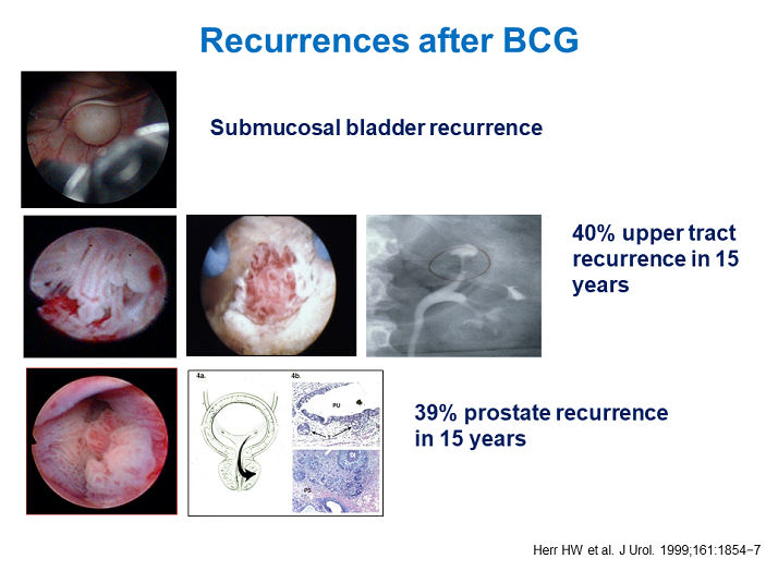 FIG. 46: Determining recurrence sanctuary sites after BCG treatment is also essential in the management of T1 high-grade bladder cancer. These sites could be submucosal or, as shown by the Memorial Sloan Kettering Cancer Center group (Figure), within 15 years could be in the upper tract in 40% of the patients or in the prostate.[53] In patients who have been treated with BCG I often survey the upper tract with cytology or selective cytology and imaging. A specimen from the prostatic urethra or of abnormal areas will help identify those patients who have disease recurrence in sanctuary sites, such as the prostate.