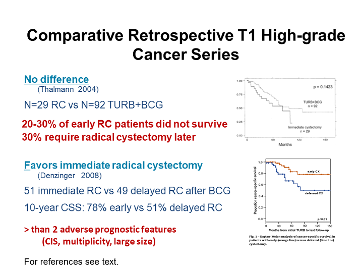 FIG. 48: Currently there are no high-quality comparison data of immediate radical cystectomy vs BCG. There are some retrospective series in patients with T1 high-grade cancer. One of these studies[65] compared 29 patients treated with immediate radical cystectomy with 92 patients who received transurethral resection with BCG. The mortality outcomes were identical, but 20–30% of the patients who were treated with radical cystectomy did not survive, thus showing that hematogenous spread had already occurred these patients, despite the fact that they had T1 grade tumors and 30% of the patients in the TURBT group eventually required radical cystectomy. They received it quite early, before progression to T2 disease, and therefore had a good outcome.