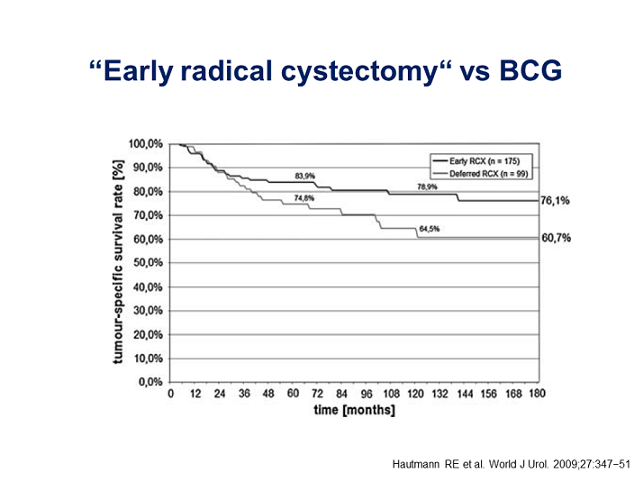 FIG. 49: There are 3 other series of early radical cystectomy that I will discuss in the next few Figures. The first study, from the University of Ulm, Germany,[67] compared 175 patients who underwent early radical cystectomy with 99 who had deferred radical cystectomy. Cancer-specific mortality was much better in those who had early radical cystectomy (Figure). Nevertheless the question remained, how many of these patients were probably overtreated, and whether those who had deferred radical cystectomy might have received the radical surgery too late.