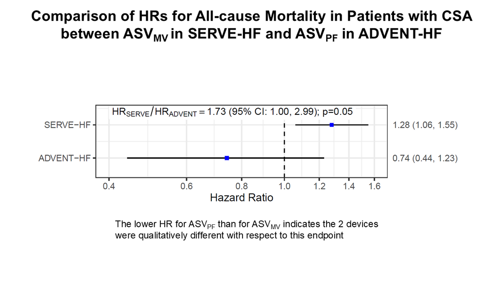 Comparison of HRs for All-cause Mortality in Patients with CSA between ASVMV in SERVE-HF and ASVPF in ADVENT-HF