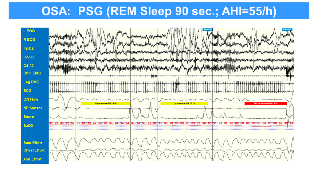 OSA: PSG (REM Sleep 90 sec.; AHI=55/h)