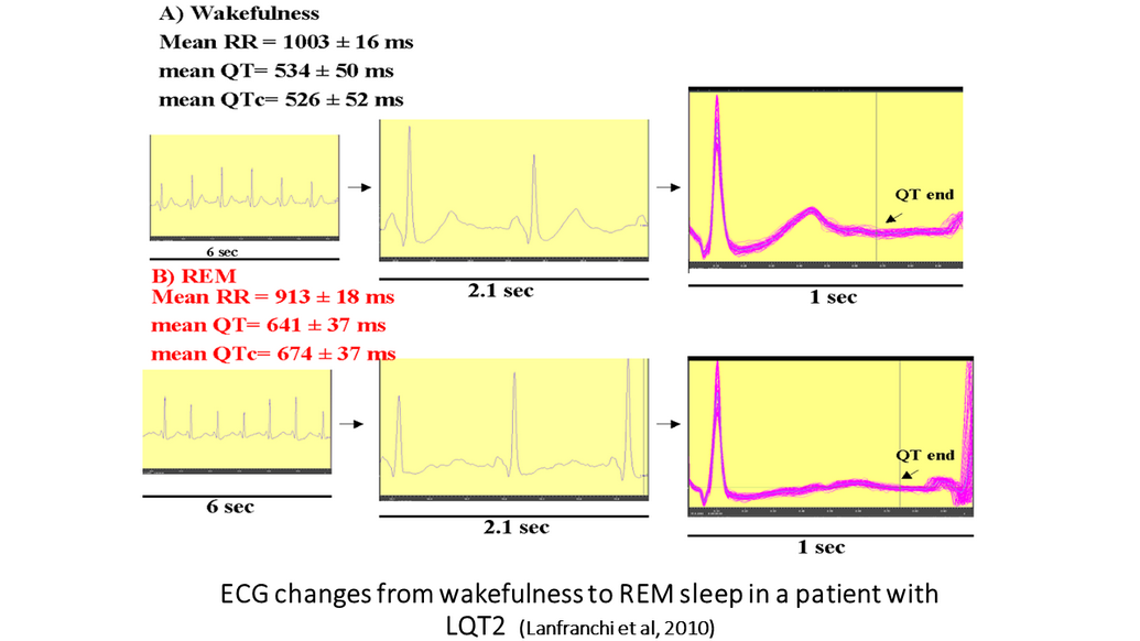 ECG changes from wakefulness to REM sleep in a patient with LQT2