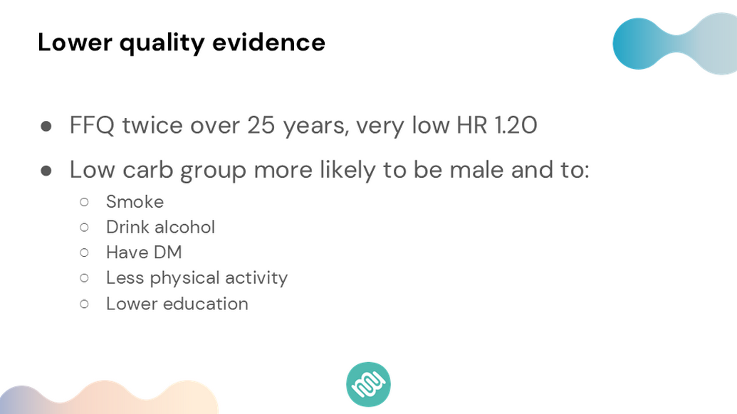 We can dig deeper and find some other concerns with this type of data. This is nutritional epidemiology – observational studies – which in the hierarchy of evidence is lower quality. That doesn't mean we should totally disregard it, but we have to understand that it is lower quality. For one, these individuals filled out a food frequency questionnaire maybe twice over a 25-year period. That's not the most accurate data collection. Second, the hazard ratios are very low at 1.2. For reference, if you remember studies that looked at smoking and the risk of cancer, those were epidemiological studies with hazard ratios of 15-20 or more, depending on the study. Not 1.20, but 20. And here we're talking about 1.20 – a very, very small increased risk in the context of observational studies.