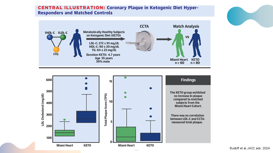 Here's the setup of this study. You can see this triangle with high HDL, high LDL, and low triglycerides – the so-called triad that makes up the lean mass hyper-responder phenotype, metabolically healthy subjects on a ketogenic diet. You can see the average LDL was 272 mg/dl, though some individuals saw LDLs of 500-600. But the average LDL was 272, with an average HDL of 90, and average triglycerides of 64. They had been on a ketogenic diet for almost five years with a mean age of 55. So, this is a pretty good cohort of people who have had high cholesterol – very high cholesterol – for about five years. They did a coronary CT angiogram – not a calcium score, though they did do a calcium score – which is a much more sensitive marker to look for coronary plaque. Then they were able to get a subset of patients from what's called the Miami Heart Study. These patients were relatively metabolically healthy as well, with a much lower LDL-cholesterol average of 120. And they also had coronary CT angiograms. So, you could compare the CT angiograms from the lean mass hyper-responder group with markedly elevated LDL, to those of the Miami Heart group with normal LDL. You can see in these bar graphs below, the difference in the LDL cholesterol, with the green being the Miami Heart and the darker blue being the KETO – dramatically different levels of LDL cholesterol. Then, the next graph shows their total plaque score. Again, this is a much more sensitive marker than the coronary calcium score. You can detect a much earlier stage of atherosclerosis using the coronary CT angiogram and the plaque score. Essentially, there was no difference between the plaque scores of those in the Miami Heart study with lower LDL-cholesterol, and the lean mass hyper-responders with markedly elevated LDL-cholesterol.