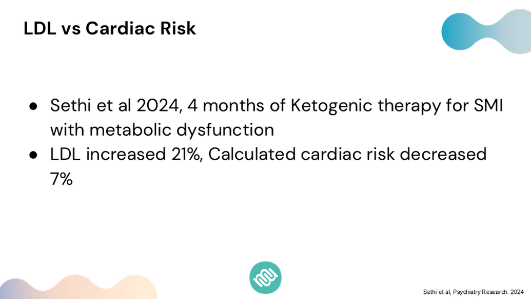 Here is a recent study from 2024, by Dr. Shebani Sethi out of Stanford, where she used four months of ketogenic therapy to treat patients with serious mental illness. Serious mental illness is defined as severe depression, bipolar disorder, schizophrenia, or schizoaffective disorder. The subjects had serious mental illness and metabolic dysfunction. After four months of ketogenic therapy, LDL went up – on average – 21%. But the calculated cardiovascular risk score decreased by 7%. Again, we see the metabolic improvements overriding – in a way – the small increases in LDL cholesterol.